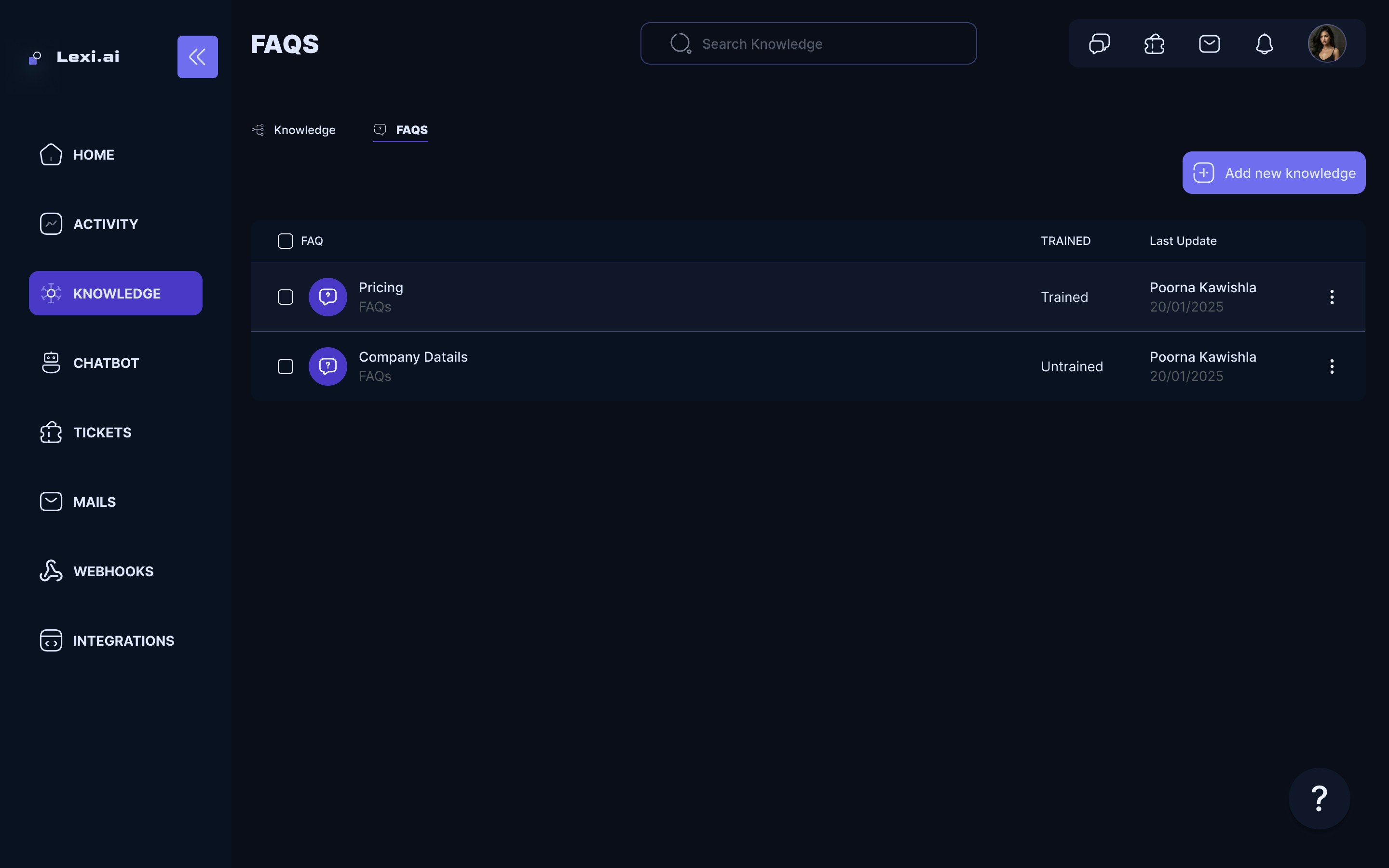 You can add your custom knowledge to the chatbot for more personalized and accurate resolutions.- On your LEXI Home screen, Navigate to Sources under the Knowledge Base section.