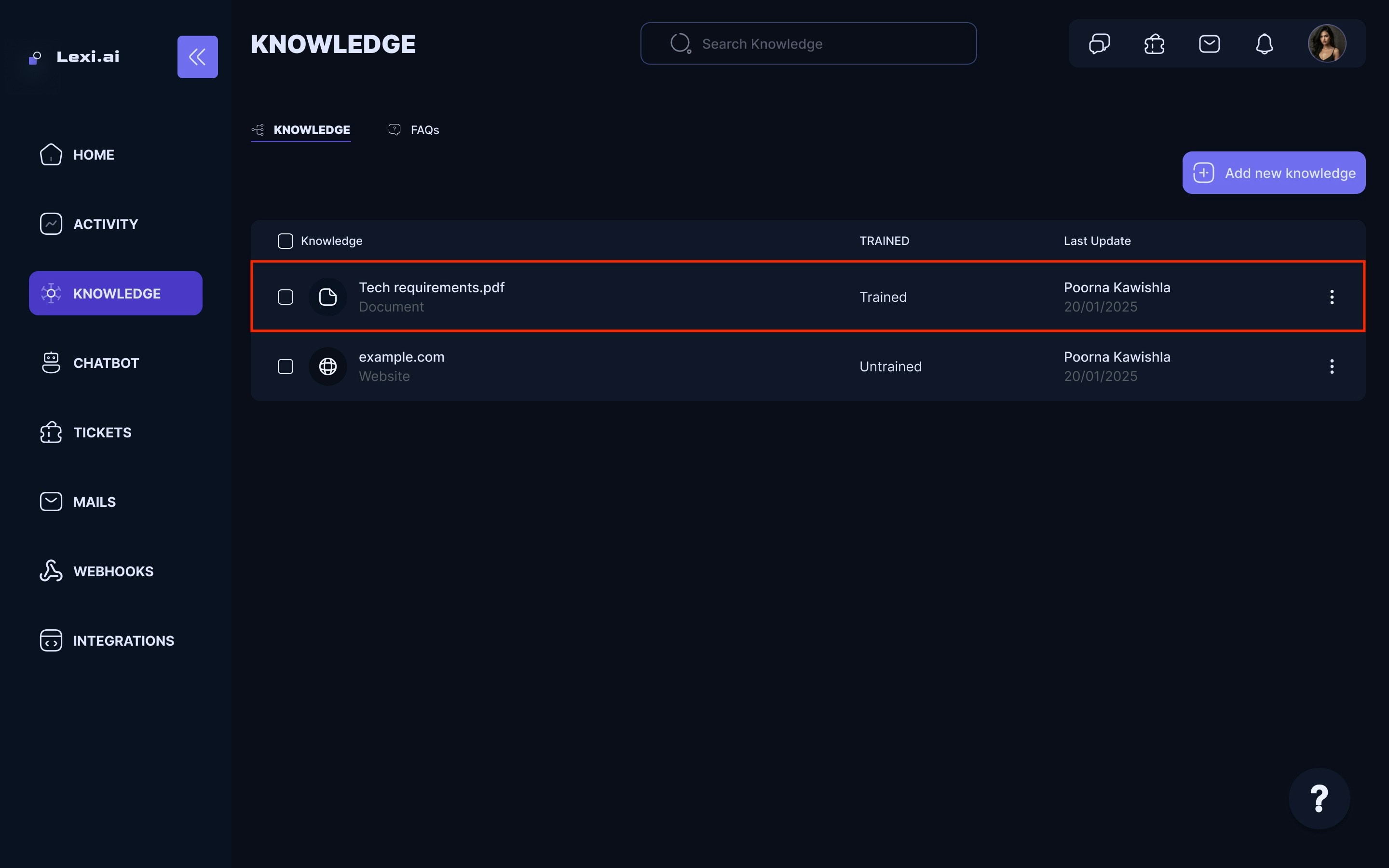 - You can add your knowledge files by clicking the Add a new knowledge.